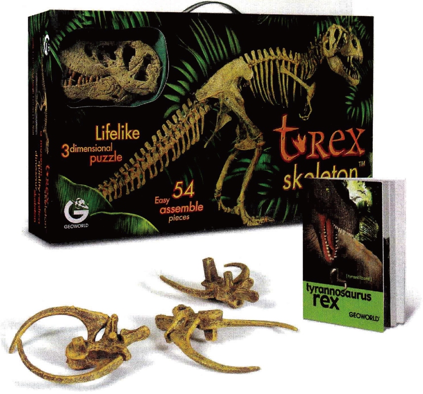 とってもリアルな恐竜、ティラノサウルスの骨格組み立てキットです!54ヶの骨のパーツをパズル感覚で楽しく組み立てていくと、